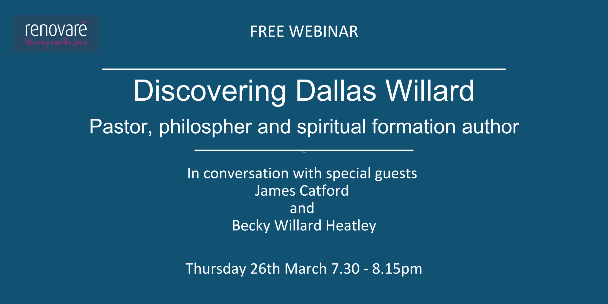 Our March 2026 webinar with James Catford and Becky Willard Heatley explored the life and legacy of Dallas Willard. While many are familiar with his books and teaching, this conversation offered a more personal perspective - sharing behind-the-scenes stories that illuminated both his public influence and private life.